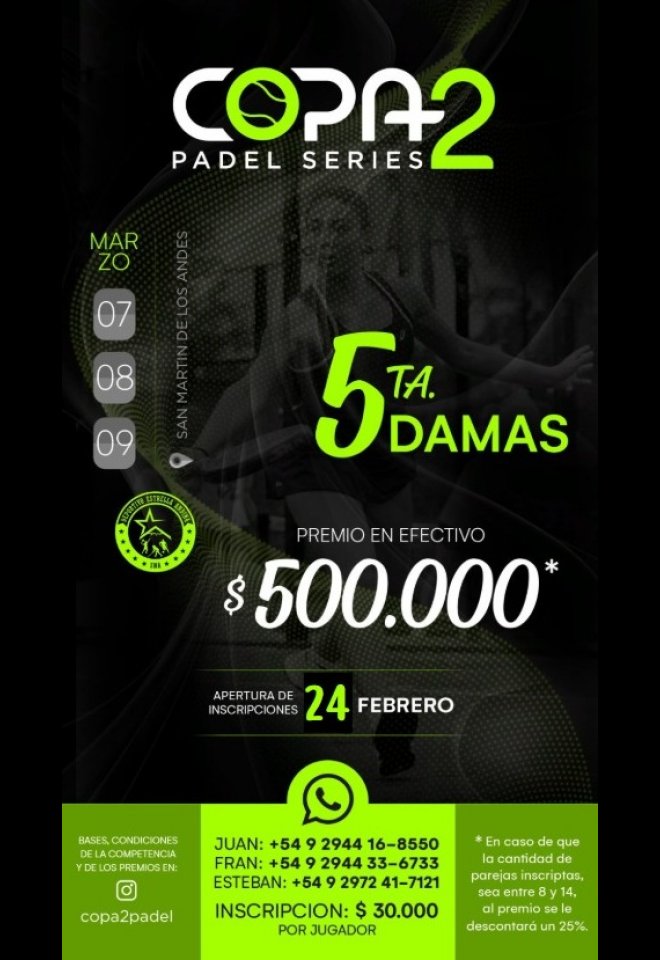 »» Evento: COPA2 5TA DAMAS ESTRELLA ANDINA »» Localidad: San Martín de los Andes »» Fechas: 07/03/2025 al 09/03/2025